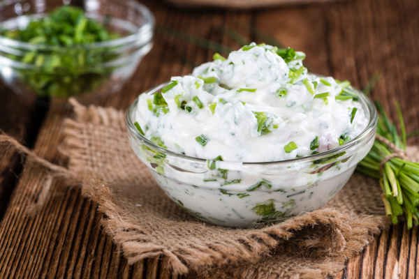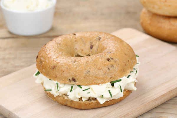 A fresh bagel sliced in half and spread with zesty scallion cream…